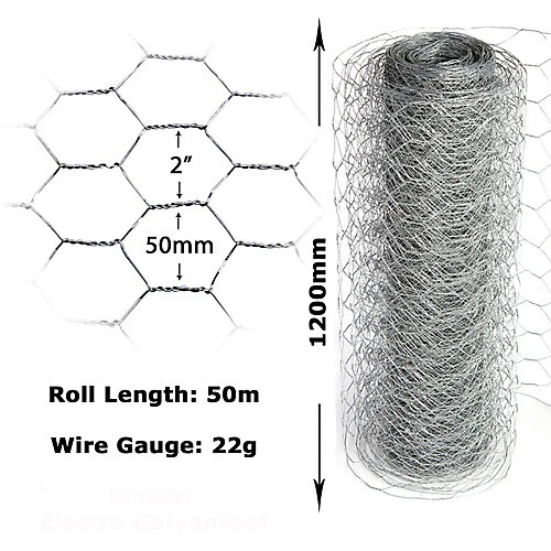 This offer is for a new roll of Chicken Wire in 50mm (2in) hole size and 25m length. Can be easily bent and cut to size. 50mm wire 20 gauge (bwg) 50mm x 1200mm x 50m (2in x 48in x 164 feet long). There are many uses for this type of wire mesh. Including aviaries, chicken coops, rabbit hutches, fishpond cover, tree and shrub protection, fencing, concrete reinforcement, garden use etc.