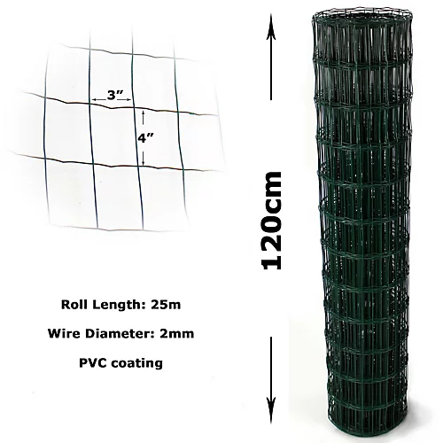 This offer is for a roll of PVC coated garden fencing. Features: Hot dipped galvanised steel with green PVC coating. 100mm x 75mm pattern (4in x 3in). Ideal for all types of fencing. Can be bent and cut to your own requirements. Use with posts, netting or stand alone. Rot proof and reusable. Size: 2mm diameter galvanized wire with PVC Coating. Packing: Will arrive rolled and packed in poly bag. Sizes: Please note all sizes and weights are approximate and allow for manufacturing tolerances. 100mm x 75mm pattern (4in x 3in) Size = 1200mm x 25m (47in x 82 feet) Weight: 3.0 kgs.