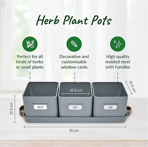 - The herb pots are made from durable steel with ergonomic handles ideal for both indoor and outdoor use. The tray is approx. 10.5cm x 35cm long, and each one of the 3 Square Pots are approx. 10.5cm x 10.5cm. The square plant pots have drainage holes at the bottom to allow water to seep out, making sure you don’t drown your plant.