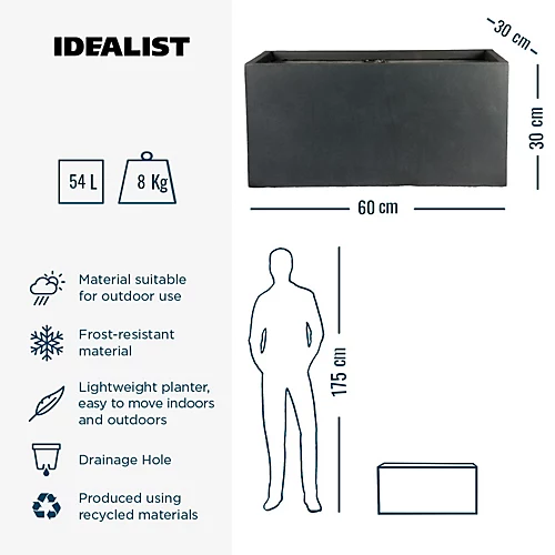 - DURABLE FIBER & STONE MIX makes the perfect material for trough planters outdoor. Dimensions displayed in the and shown in the visual imagery are outer edge/lip measurements. (Outer edge to outer edge) This planter has a top edge solid lip that has a thickness of up to 2-3 cm on each side. This will reduce the maximum inner planting space by a total of 4-6 cm