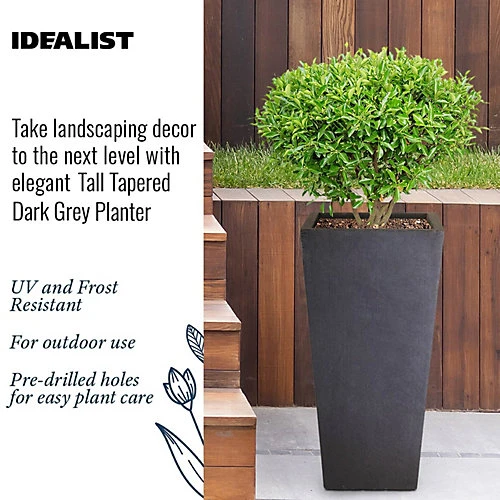 - UV & FROST RESISTANT tall tapered plant pot. The textured surface of this dark grey planter from IDEALIST resembles concrete. Place it in the garden for stylish flower arrangements