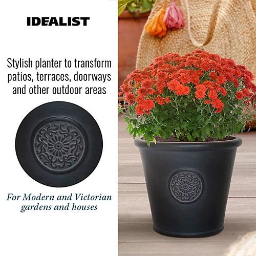 - DURABLE FIBER & STONE MIX makes the perfect material for an outdoor planter. Dimensions displayed in the and shown in the visual imagery are outer edge/lip to outer edge/lip measurements. This round plant pot has a top edge solid lip that has a thickness of up to 2-3 cm on each side. This will reduce the maximum inner planting space by a total of 4-6 cm