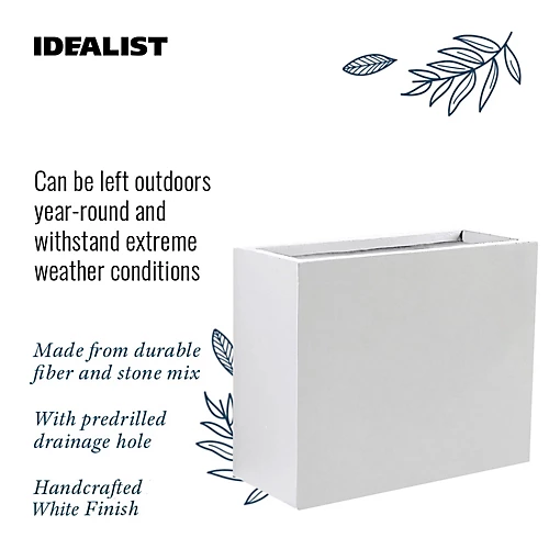 The rustic appeal of stone surfaces has been beautifully captured in this rectangular concrete planter. The rectangular plant pot is made for all types of outdoor conditions — no matter how cold or wet it gets. A great addition to the terrace garden, deck, patio, outhouse, balcony, veranda, or the porch. Its elegant white color highlights the hand-finished surface even more. This trough planter can be a great gift for someone who enjoys gardening or wants the latest addition in modern landscaping elements!