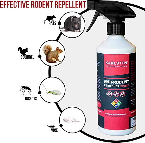 Karlsten natural mice/rodent repellent spray extensively repels and all kinds of rodents (all mice and rats) without the slightest harm to humans along with a characteristic fragrance of its own. Made from natural products safe for the environment. Keeps your pets away while spraying. The Rodent Repellent Spray is just one spray away from making your living rodent-free and healthy.