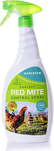 Karlsten Due to the physical mode of action red mite cannot become resistant to the contact formulation. Contact Red Mite Control Spray controls all stages of red mites’ life cycle Including eggs, larvae, nymphs and adults on contact. Remove all eggs, feed, eating, drinking utensils and birds.