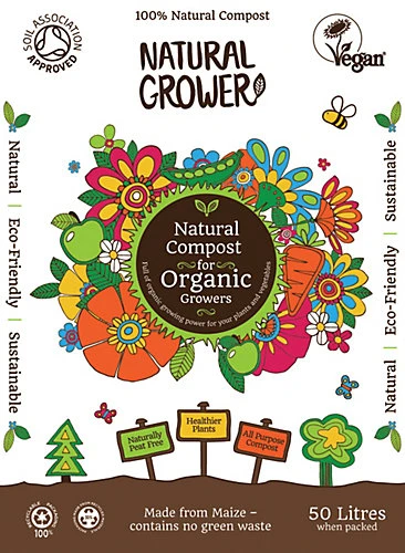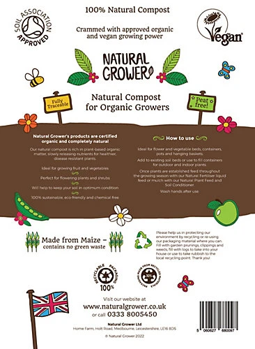 Natural Grower peat free compost is certified organic, biodynamic and vegan by the Soil Association, Biodynamic Association and the Vegan Society. Made with our fabulous plant feed, the compost provides all the balanced nutrients and trace elements that plants need. With all its wonderful moisture retaining and aerating properties, watering requirements during the hot summer months will be reduced. When added to your vegetable or flower beds the compost will improve the long term structure and organic matter content of your soil. Containing all the nitrogen, phosphorous, potassium and trace elements your plants need, you will have strong roots, healthy green foliage and repeat flowering, along with increased resistance to disease. Top up the nutrients with Natural Grower’s liquid feed throughout the year, and you will have the best yields and blooms ever! Suitable for outdoor and indoor plants, our all purpose compost can be used for container and pot grown plants, as well as in vegetable beds and flower beds. Sustainable, British, fully traceable, greenwaste and chemical free.