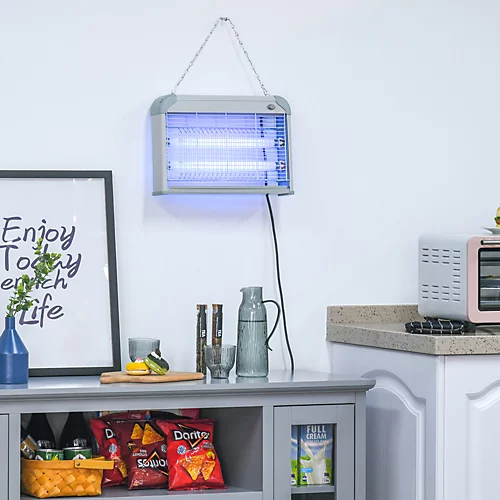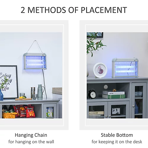 The portable mosquito killer lamp from Outsunny is energy-efficient, non-radiative, noiseless and odourless, effectively protecting you against mosquitoes, flies and other pests. The fully enclosed protective screening avoids accidental electric shocks, and the removable collection tray slot is easy to clean. With 20 W high efficiency and 60㎡ effective room coverage, it helps create a more effectively protected space by being mounted on the wall or ceiling with the hanging chain. The functional mosquito killer lamp is an ideal adddition to your patios,decks,balconies and more.
