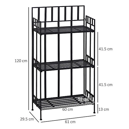 - • Item Name: Folding Metal Shelf • Brand Name: Outsunny • Material Used: Metal • Colour: Black • Dimension: 61L x 29.5W x 120H cm • Folded Size: 123L x 61W x 4.5H cm • Shelf Height (From top to bottom): 96cm, 54.5cm, 13cm • Shelf Size: 60L x 28W cm • Weight Capacity: 10kg(Each tier) • Net Weight: 10.5kg • Flat Pack: NO • Custom Label: 84B-274