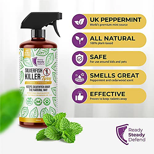 Formulated by professionals, Ready Steady Defend Silverfish Killer is an effective approach to fighting silverfish – naturally. Ready Steady Defend Silverfish killer is child and pet-safe, so you can spray it without the worry of contact with dangerous fumes or pesticides. This humane silverfish killer spray works to remove silverfish quickly and effectively. Ready Steady Defend Silverfish killer uses naturally derived non-toxic ingredients like peppermint oil and cedarwood oil, which is known to be a natural solution, to safely help get rid of silverfish inside your home. The natural, strong scent of peppermint and cedarwood removes silverfish from your home and prevents them from attracting other silverfish with their natural scent. The natural oils within this spray keep their scent for longer than synthetic equivalents, requiring periodic reapplication and providing an effective, long-term solution.