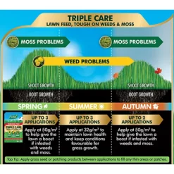 This product is an effective lawn fertiliser to use for lawns with weed and moss problems. Its triple action formula will green-up the lawn, kill moss and 12 of the most common types of weeds such as dandelions. The complete nutrient package will help create a healthier lawn to crowd out weeds and moss. Use on established lawns (6+ months) from May to reap the benefits of a nice looking lawn during spring and summer seasons. Tip: If you had a large amount of moss or weeds in your lawn and bare patches are left after usage of Aftercut All In One fill the bare patches with our Gro-Sure Smart Lawn Seed or Smart Patch for optimal results.